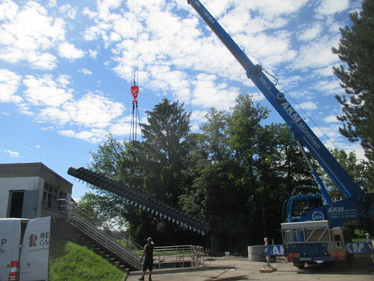 Nein, keine echte, sondern wie im Autobau, wenn der Motor in die Karosserie eingehoben wird. Mithilfe eines Kranes wurde die 3 Tonnen schwere Hebeschnecke auf der Karlsfelder Kläranlage zurück in ihr Betonbett gehoben. Rund 4 Monate dauerte die Sanierung in Ehingen. Dort wurde der Schneckenkörper überarbeitet, mit einer neuen Keramikkunststoffbeschichtung eingekleidet und die stark strapazierten Wicklungen zusätzlich aufgepanzert. In der Zwischenzeit wurde in Karlsfeld das „U“-förmige Betonbett sandgestrahlt und neu aufbetoniert. Auch die Antriebseinrichtung, die Lager, wurden erneuert, so dass die Hebeschnecke, die das Abwasser um rund 6 Meter anhebt, wieder für die nächsten 50 Jahre einsatzfähig ist. Die Hebeschnecke ist eine archimedische Schraube, die mühelos Abwasser mit ihren Grobstoffen transportieren kann, bis zu 130 Liter in einer Sekunde. Zum Vergleich, eine Badewanne misst ca. 100 Liter. Zwei weitere Hebeschnecken gewährleisteten den Abwassertransport in der Sanierungsphase und für Notfälle wurden mobile Pumpen vorgehalten. Nach dem Motto, bei uns läuft‘s immer, muss auch in Zeiten von Corona der Betrieb mit Notfallplänen aufrechterhalten bleiben. Im weiteren Verlauf dieses Jahres werden weitere Anlagenteile, wie die Fördereinrichtung der Solarhallen und die Nachklärbecken, gewartet und repariert. Abgeschlossen sind bereits der Solarhallendach-Austausch sowie mehrere kleinere Reparaturen an der gesamten Anlagentechnik. Um auch für die Zukunft bestens gerüstet zu sein, wird die 55 Jahre alte Kläranlage bautechnisch und elektrisch überplant. Diese notwendige Zukunftsplanung war ein wesentlicher Bestandteil der neuen Genehmigung, die zum 1. Januar 2021 für die nächsten 20 Jahre in Kraft tritt.