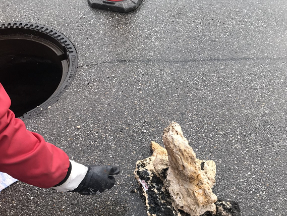 Massive Fettablagerungen im Kanalnetz behinderten die Kanalsanierungsarbeiten stellenweise erheblich. Fette bleiben an der Rohrwandung haften und verstopfen den Kanal. Es besteht die Gefahr einer Rückstaubildung! Beeinträchtigungen von Grundstücksentwässerungsanlagen können die Folge davon sein.