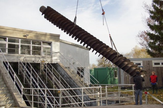 Nicht irgendeine Schnecke ist gemeint. Es handelt sich um die 57 Jahre alte Hebeschnecke der Kläranlage Karlsfeld, die seit 1965 dafür sorgt, dass das Abwasser der Karlsfelder Bürger angehoben bzw. gepumpt wird. Diese archimedische Schraube hebt das aus dem Kanal kommende Abwasser um 4,5 Meter an, so dass es durch die einzelnen Reinigungsschritte der Kläranlage fließt. Die Reise der Schnecke geht nach Ehingen. Dort wird der Metallkörper sandgestrahlt und neu aufgebaut. In der Zwischenzeit wird auf der Kläranlage ihre Wanne, genannt Schneckentrog, ausgebessert bzw. neu betoniert. In ca. 5 Wochen bekommt die Karlsfelder Abwasserreinigungsanlage ihre alte Dame im neuen Gewand wieder. Eine spezielle Kunststoffbeschichtung und eine Panzerung der Verschleißkanten soll für den reibungslosen Betrieb der nächsten 50 Jahre sorgen.