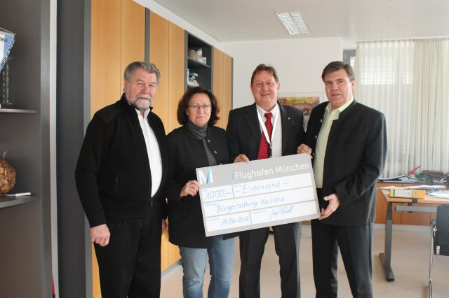 BU: V.l. Gerhard Proske (Vorstand der Siedlergemeinschaft Karlsfeld-Nord), Christa Berger-Stögbauer (Festreferentin), Josef Rankl (Flughafen München) und 1. Bürgermeister Stefan Kolbe bei der Scheckübergabe.